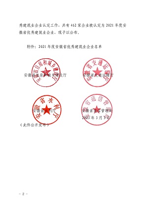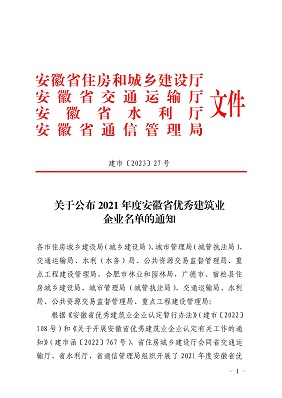 根据《安徽省优秀建筑业企业认定暂行办法》和《天行体育平台_天行(中国)开展安徽省优秀建筑业企业认定有关工作的通知》。省住房城乡建设厅会同省交通运输厅、省水利厅、省通信管理局组织开展了2021年度安徽省优秀建筑企业认定工作。